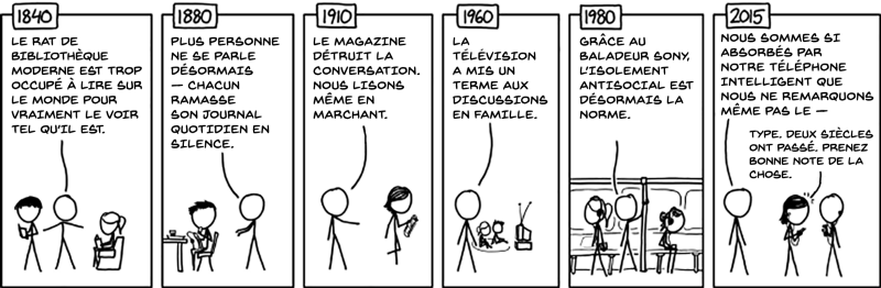 Il est facile de passer de la perspective de la normalité à celle d’une profonde inquiétude à l’endroit de la technologie. Beaucoup de choses ont été écrites sur les paniques morales liées à la technologie et une bonne manière d’entamer notre réflexion à ce sujet est d’avoir une perspective historique sur la question via the webcomic xkcd: